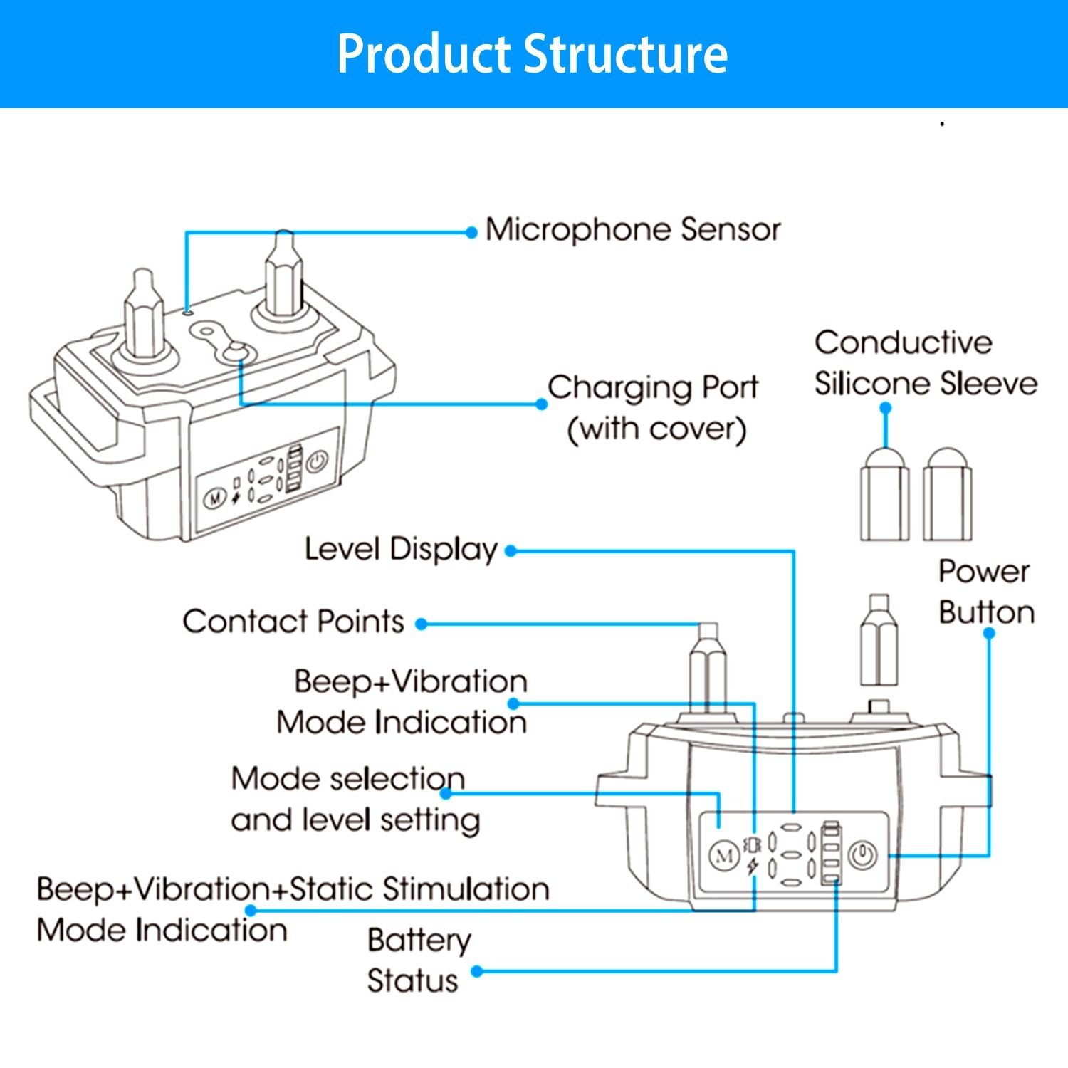 *Dual Training Modes*:Barking collar has beep,vibrate and static training modes to help your dog correct uncontrolled barking and develop better behavior;static stimulating mode is optional,you can customized this bark collar as a dog static shock bark collar or no static shock bark collar. Strong and powerful motor,also the static stimulating function conforms to ECMA form.