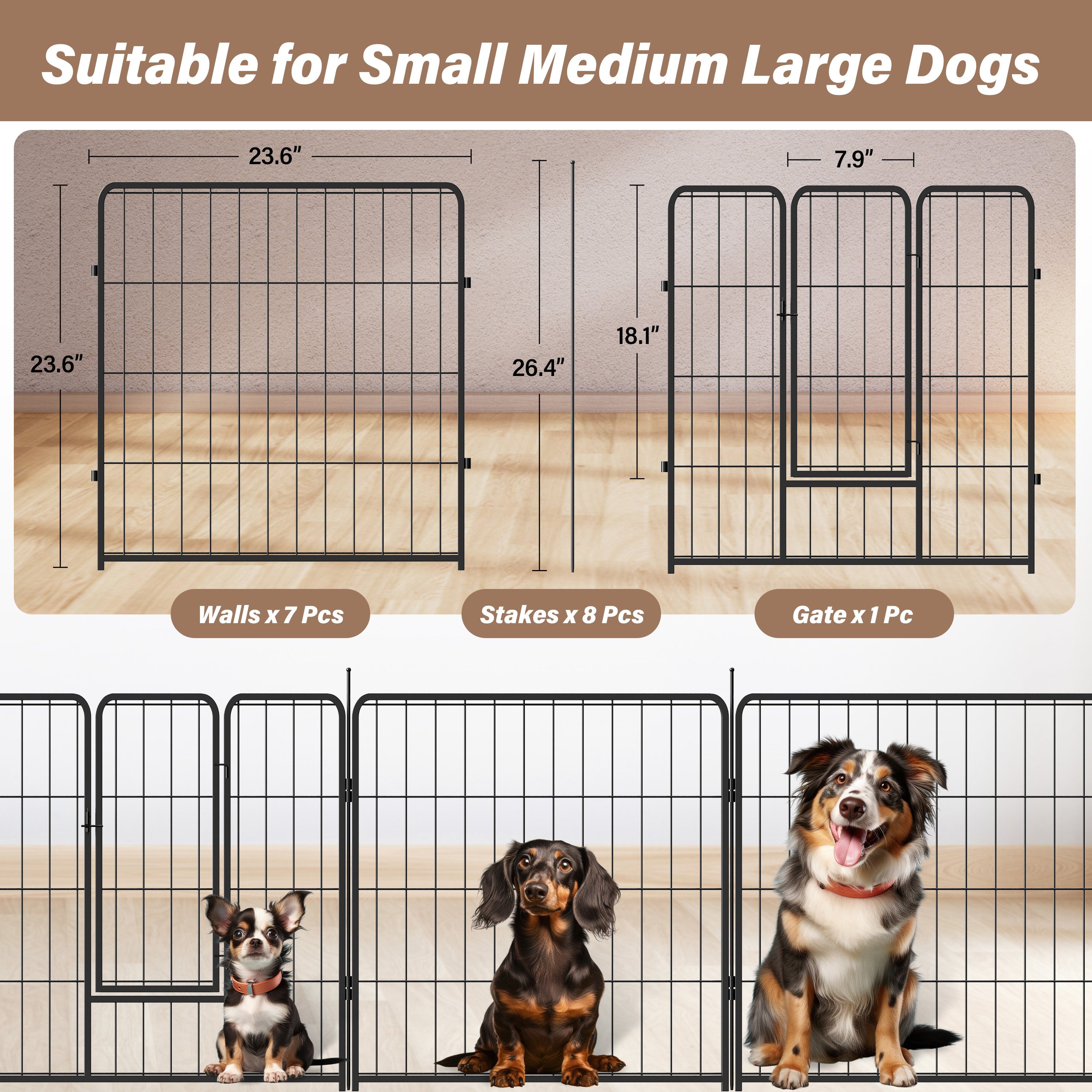 [Iron Fence] The 8 panel dog playpen indoor fence for dogs is made of iron with black anti-rust coating. The metal playpen is free-standing, however, if you have a naughty puppy, you might secure the playpen to the ground firmly for double safety.